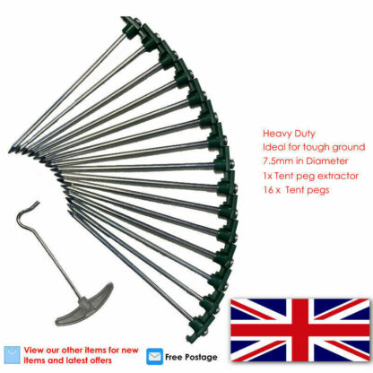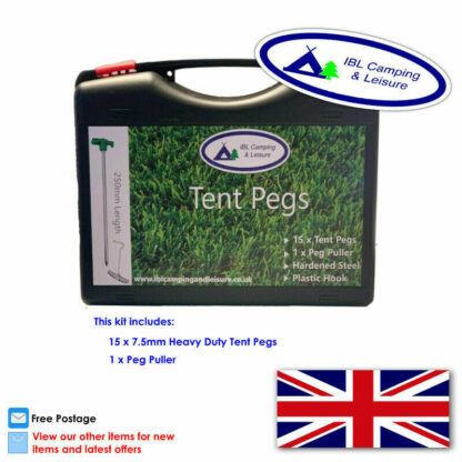 16 Piece Camping KitProduct Description15 x 7.5mm in diameter heavy duty tent pegs. 1 x Good quality case designed for carrying good quantities of tent pegs. 1 x Tent Peg Extractor.