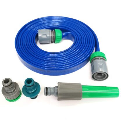 Flat Blue Hose comes on its own reel so that it is nice and compact, ideal for storage. The hose can be connected to any hose lock type connection. Includes a double male connector, a Jet hose end and a spare tap adaptor. NOTE:Main photo shows the 10m variant not the 5m supplied.