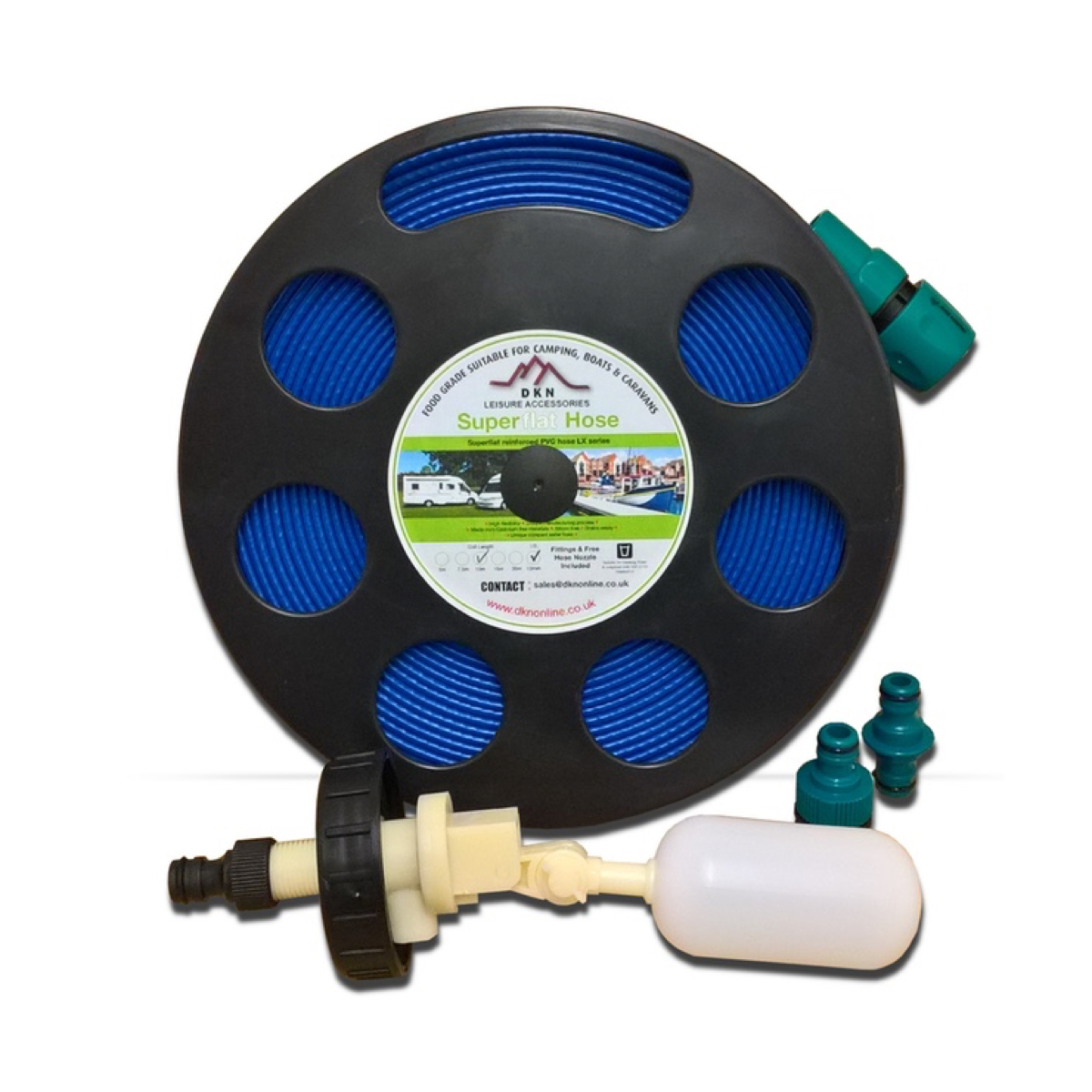 The Flat Hose with reel is nice and compact, ideal for storage in the Motorhome, Caravan, on a Canal Barge or a Boat.