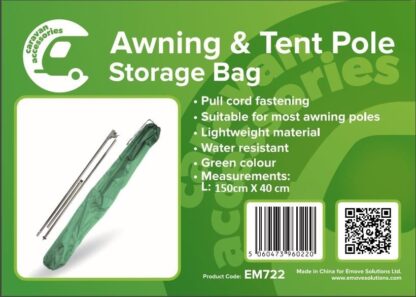 Ideal for keeping your awning poles clean and tidy. This high quality storage bag comes with pull cord fastening. Water resistant. Green Colour. Measurements: 160cm x 45cm.