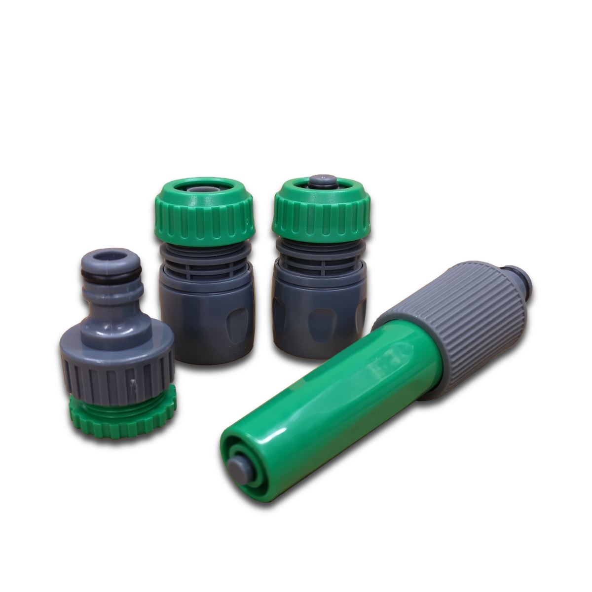 Hose Quick Fit Set uses universal hose-lock system. Includes adjustable nozzle, two hose ends and a tap adapter.