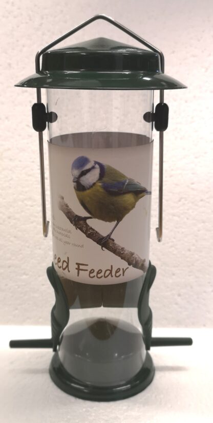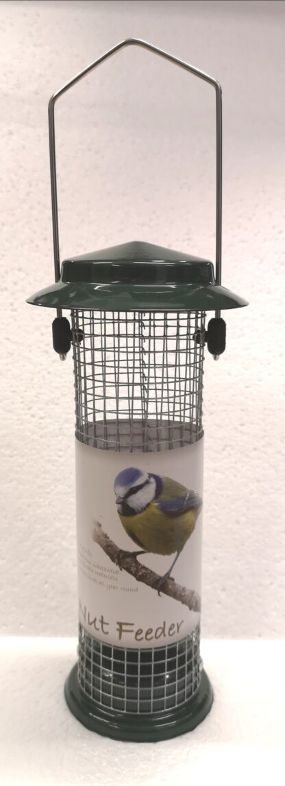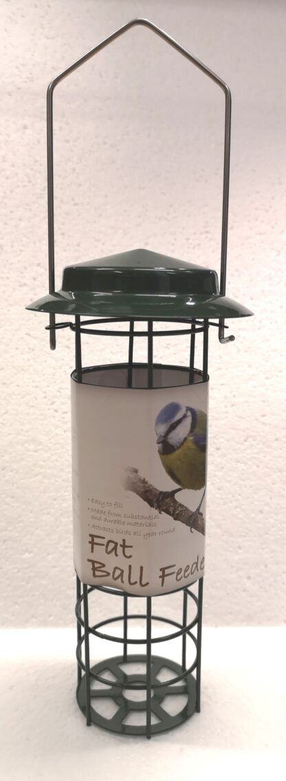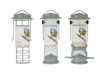 Durable metal feeder, plastic coated in sage or racing green colour. Weather proof & rust resistant. Features 2 feeding ports in seed feeder & strong metal hanging ring. Easy to fill & clean. Mixed carton of Seed, Nut & Fatball feeders.