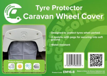 Designed to protect tyres when parked. Prevents the sun’s harmful UV rays causing tyre degradation. 2 Eyelets, plus pegs for securing into soft ground. Fits wheels sizes 13″-15″. Contents: 1 cover per pack the pegs.